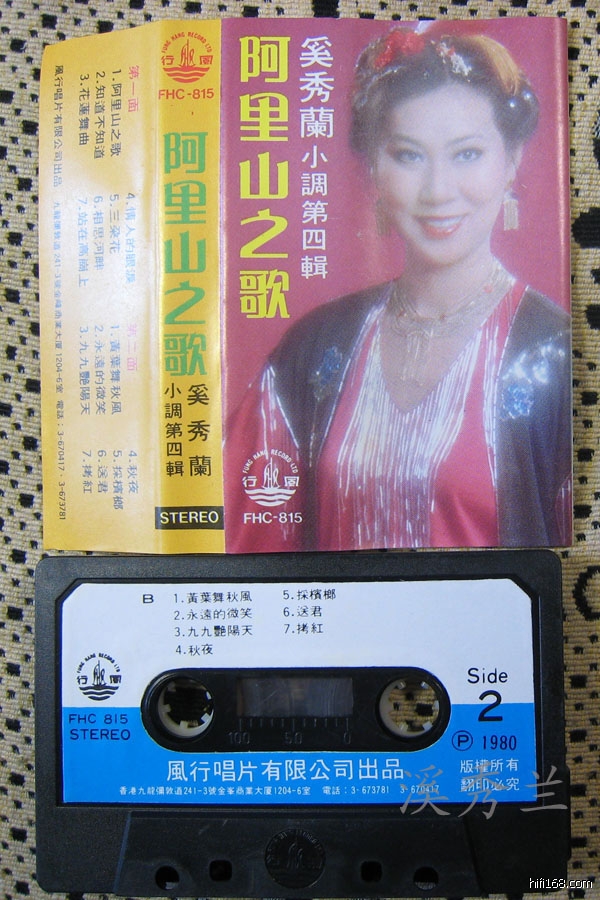 原帖由 溪秀兰 于 2007-12-12 23:39:00 发表最近收的录音带,风行唱片有限公司出品的原版带,磁带盒的背面有风行公司的番号:《奚秀兰第四辑 阿里山之歌》、《奚秀兰第九辑 中国名曲集》
