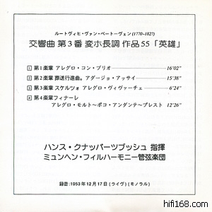 “怪物”Hans Knappertsbusch(1888-1965)的Beethoven交响乐没录全,完整的录音只有2、3、5、7、8,此外据说还有些许其他的录音片段,不过似乎在CD上看不到踪影。第三号“英雄”Kna留下了四次录音: