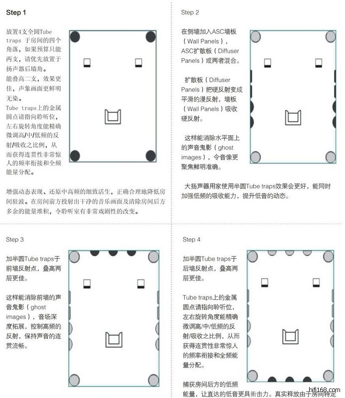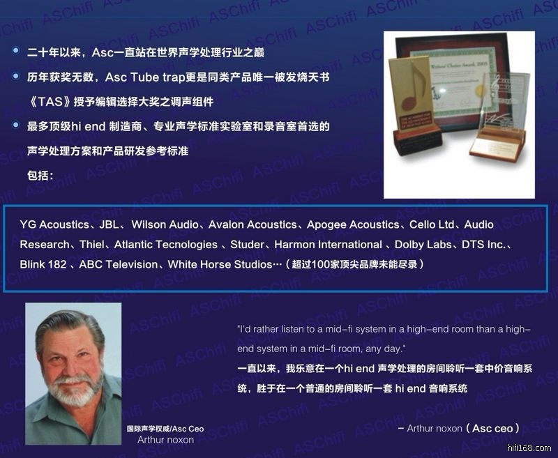 1.从大的理念上,asc把专业录音处理和民用hi end对空间的处理区别,录音室中的声场较为复杂,受房间模式的影响在低频段起伏较大。因此,在整个频段上获得同样的混响时间、较平直的频率响应以及准确反映声像位置的壁面反射特性一直是录音室设计中的首要问题。概括来说就是业内对录音室升学处理公认的规则:(活端死端)End一Dead一End理论2.在传统发烧友的理解中,多年以来,都默认接受了台湾刘汉盛先生的“前硬-中吸-后扩散”,这是在业余条件下,在没有一个较佳比例空间和容积下,对中低端系统的一个定性总结,应该说是一个较成熟的思路,也被广泛接受。但是,当有条件拥有一个独立的听音室,并我们希望更深层次去探究器材本身的原貌,那么这种简单定性的“前硬-中吸-后扩散”,是远远不够的,或者说,缺乏一个具体定量的可操作性。带来的实际问题就是:每个依照这个理论处理的空间,因为材料选择,每个局部的处理程度,整体调声的理解差异,造就千变万化的声音,而且缺乏一个可执行的标准,完全属于空间diy范畴。3.“前硬-中吸-后扩散”成立的主要理由来自:不希望喇叭的后墙吸收较多的功放机力水,这对一些中低端的机器,是有现实意义的。但对于高档系统,显然很多情况是:功放机受制于恶劣的声学环境,远远未能释放出他的最佳工作点,也就是说,音量未敢释放到“黄金功率”的范围。因此,对于更高要求的发烧友和系统,我们需要一个更专业,可定量的声学处理模式,以便更深层次去聆听感受器材的潜力,获取更客观的来自设计师理念的充分表达。4. asc最大的贡献就是,把录音监听的声学处理,和民用hi end的实际情况,作了一个巧妙的平衡,既吸收(活端死端)End一Dead一End理论的精华,也充分考虑到在家居环境下民用hi end系统的主观听感需要。我们可以简单概括asc的hi end系列产品属于“half-End一Dead一End”类别,意思是,他对喇叭的后墙,既是吸收,也是反射,同时还具有宽频扩散特性,并在整体上达到一个较声的平衡,一举解决了其他hifi声学道具没法解决的问题:按照比例去定量控制发射-吸收-扩散,并完成一个整体宽频下的平衡。而传统我们接触到的hifi 道具,都只是针对某一个环节,或者某一个频段做一些初级的工作,他们彼此之间缺乏一个有机的协调工作关系,这给我们的业余应用带来很多变数,难以定量操作。5.如果从更深的层次去理解asc,则远非只是以上的这些,asc 把一个空间里面的声音传递过程,完整而有机的进行细分管理,从asc的产品系列中,我们看到每个部分都是互相配合,并且是模组式的定量协调配搭,最终完成一个对声音发声源-消失的过程的完整处理流程,而这个处理流程中,都严格符合RT60的标准。这个问题我们可以以后逐步深入。6.现在我们先去接触asc处理模式下最基本的东西,也就是他最引以为傲并为90%以上国际一线hi end制造商所采用的道具-- 圆柱型音井,asc tube trap给我们引入一个国内发烧友从来没有接触过的理念,而这些理念早在20年前已经为众多录音室,著名的hi end制造商所接受:一个具体聆听空间里面首要解决的 head-end ringing(头端振铃)。通过清理头端振铃,极大地再现低电平下的细节中端和高音。asc认为,发烧友在传统业余条件下吸收第一次反射点虽然改进了结像,但没有治疗头端振铃,有这种无处不在的纵向和横向的空气震动,there’s this slug of vertical and lateral shaking of air that oozes past the listener about a twentieth of a second after the direct signal and blurs musical detail and imaging. After we’ve addressed head-end ringing, then we control first reflections(需要您自行翻译理解).7. 如果说,传统依照“前硬-中吸-后扩散”处理的聆听空间是一个业余diy式的声学环境,那么asc 提供一个hi end级的成品可调空间处理解决方案,并成为众多hi end 制造商选择的产品设计参考。很值得高要求的发烧友去体验高档器材的原貌。 以下是多年以来,一直采用ASC声学解决方案作为产品开发参考标准的厂商(录音室)名单: