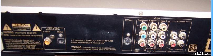 后盖上的东西某些方面比普通DVD多,某些方面则要少。多的是它内置的六声道杜比数码处理器输出口和专为投影机所装的视频输出--幸运的投影机拥有者。少的是它只有一路S端子,一路Scart输出的一套数码输出--包括一个光纤输出。但这不值得什么,因为很少有放大器没有这些输入口。