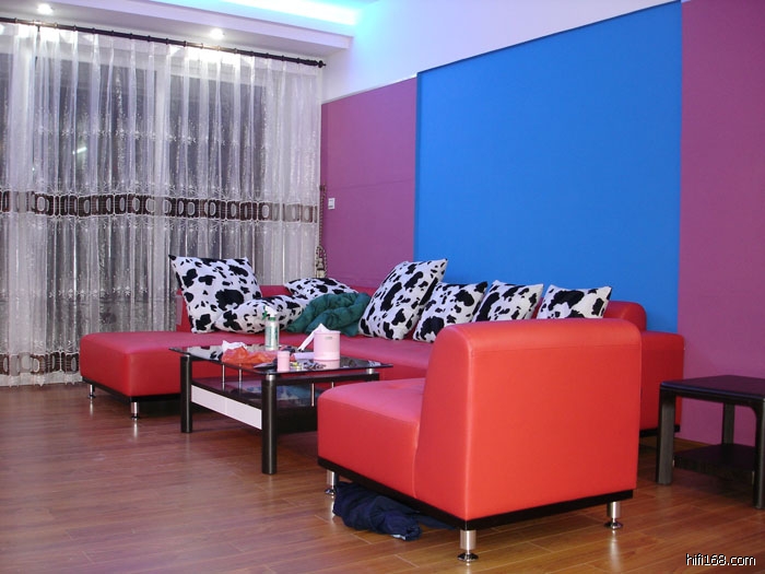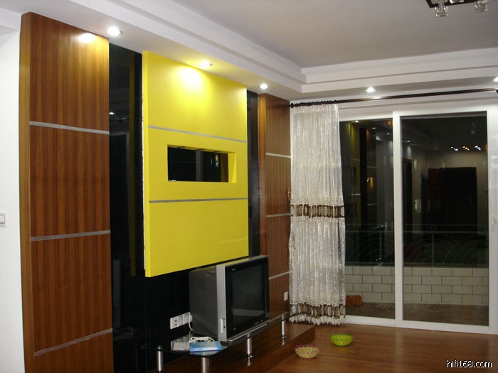 给我家用型装修的几张图示作参考,我这个不是用来听音乐的,所以没按照听音环境处理,但试摆器材听过了,效果还是可以的,我这个厅宽4.6米,长10米.是连着饭厅,总46平方.前墙做了艺术墙,后墙也做艺术墙,但简单一点.地板我大厅隔开用做两种材料,瓷砖和木地板.