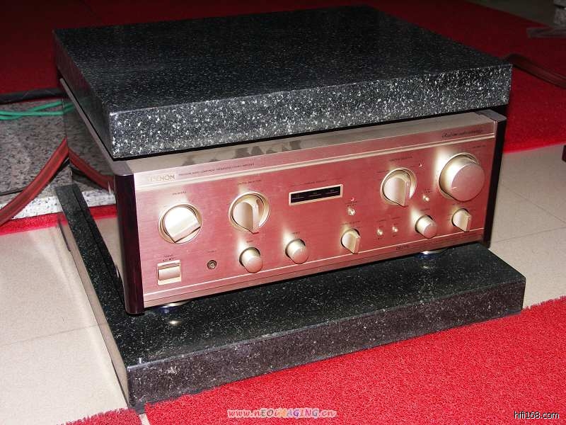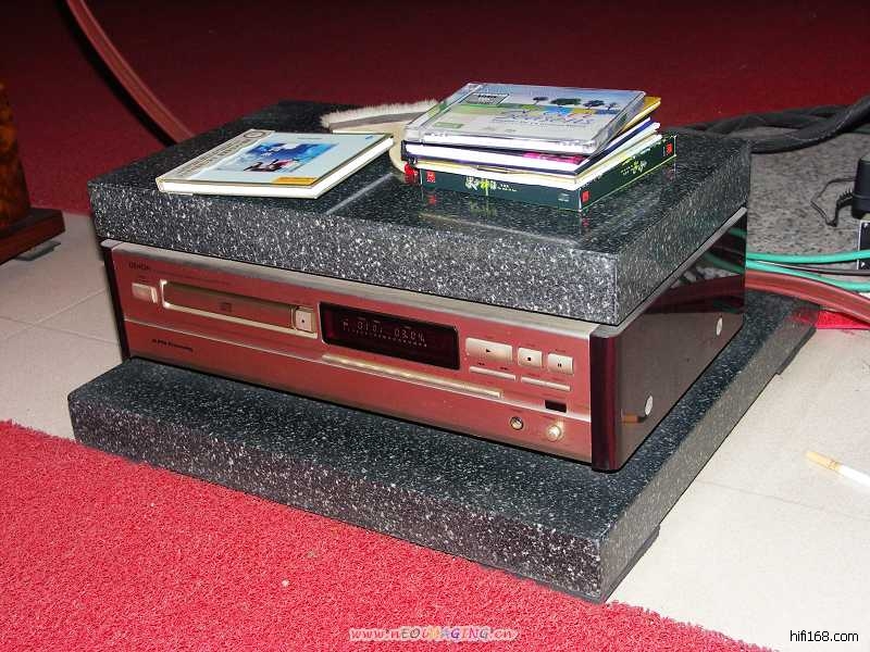 这对小小的落地箱子用的是两只4’(或4.5’?)中低频单元+一只1’高音单元,高度大概70cm左右,为了达到正常的听音高度及较好的效果,发烧L兄为每只箱子垫上了两层爵士音响专用垫板。之前我帮他从阳朔弄了两块厚重的大理石,听说声音比较硬,后来就换掉了,…………