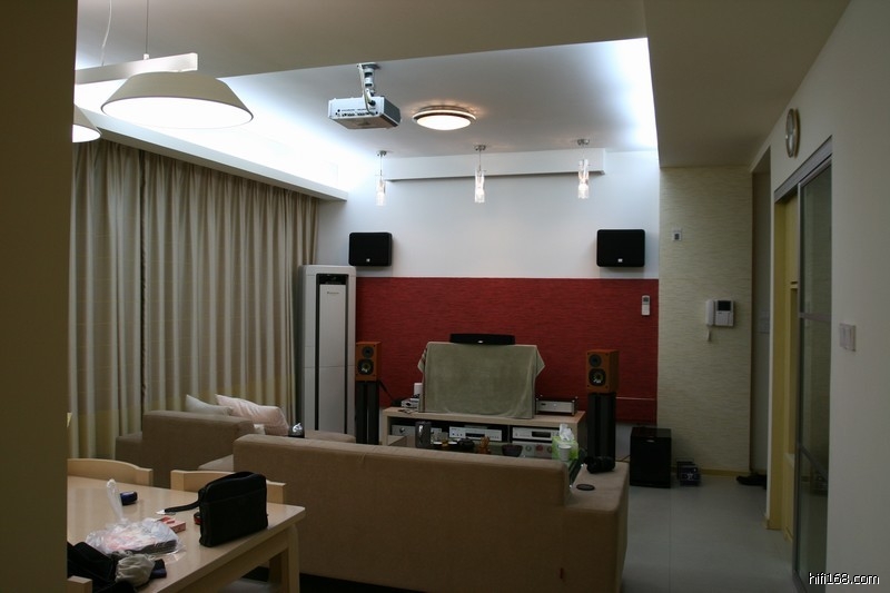 客厅长5.4米,宽3.9米,高2.7米.左右墙面完全不对称,还有餐厅部分有大量吊顶空腔.厨房门为全玻璃结构.茶几也是大型钢化玻璃.地面压光瓷砖铺设,以上是不利面.空调柜机(相当于一个驻波消除器)布艺沙发,左面全墙面窗帘,左后方连体落地实木陈列架,右前方(放饮水机的地方)结构为结实的木工板空腔,茶几下面是3CM厚地毯,全实木餐桌,这可能是有利面