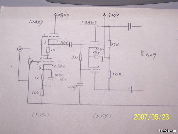 和晶体管放大电路一样,电子管放大电路中的一些地方也是可以灵活变通的。如下图,它的第一级SRPP和第二级长尾倒相,便可改变成如图二所示,但12AU7就要比6FQ7容易找到多了!