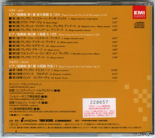篇幅又超了,回说本CD的曲目先……两首List的钢协(NO.1、NO.2)搭Chopin E小调(NO.1),真是极好,在战后,Francois经常在演奏会中连续演奏多首协奏曲,例如1959年他曾经跟Andre Cluytens(1905-1967)在一晚演奏四首:Bartok NO.3、Chopin NO.2、List NO.1以及Ravel的左手协奏曲。本唱片的List录于1960年6月13、14日的Kingsway大厅,Chopin则录音于1954年5、6月,都是炒冷饭的录音,大家不会陌生。选个Chopin第三乐章听听吧,这音质很不错的~~