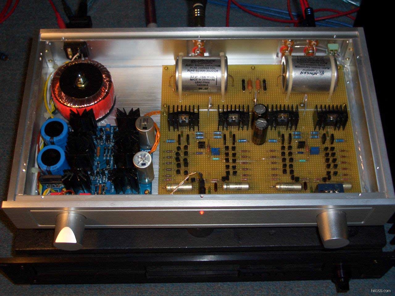 主要原件大致如下:电阻,主要为美国CADDOCK和英国HOLCO;电容,黑金刚(blak-gate,);机内线:搭棚线、信号通道均为纯银线;最后还有:特别定制的A类矽钢片变压器。