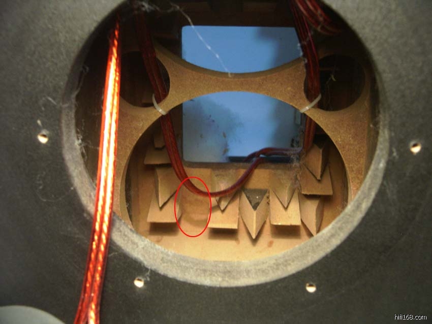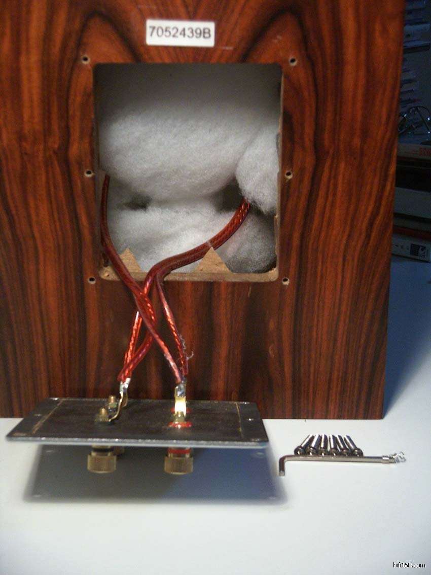但是,对于整个音箱设计的灵魂——分频器,尤其是“监一改”的分频器,我相信大多数发烧友都没有办法去摩改,所以,我最感兴趣的当然是它那“极尽发烧之能事”的星点一体化全密封分频器!当我好奇、期盼、渴望、紧张、小心地拧开那大大的铝板(大家都知道它的分频器是同接线端子等结合在一起的,所以要非常小心);让我不能理解的事实出现在眼前——薄薄的铝板上只有四只接线柱,然后是四根连接线引向音箱的顶端,由于有吸音棉和中间的多孔隔板,我看不清线的那一头是什么情况,但是,我已经明白一点:这个状况与厂家公布的设计是完全不同的,而且,这块薄薄的铝板,在整个箱体上非常薄弱,因为它所占的面积大概有1/4背板,这样一来,对于中低频的吸收扩散,肯定会带来一定影响!