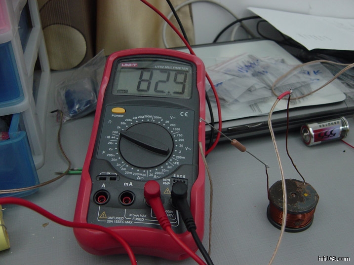 这里大胆将分频点选在300Hz左右,实际计算为305Hz。一定要分低一点才有好效果啊,一定不能悭钱。查表知L=7.77mH,C=60.709uF。L大得恐怖,几乎没有厂家肯加工,这里为了减少直流电阻,用1.5mm的漆包线做磁芯电感。C由美国EC50uF电容与REL-CAP12uF电容并联(实测数值=60.7uF)。由于工作在较低的频率里,低通分频不设阻抗补偿,如设,可由30uF电容与8欧电阻串联而成。