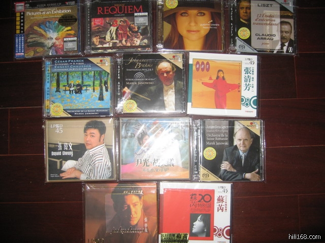 昨天刚拿到的几张新出的SACD和LPCD45,还有两张VANGUARD CLASSICS的SACD。LPCD45确实好象做大了,现在丰华唱片也加入了。最好能把以前飞碟的一些也制作出LPCD45。感觉LPCD45格式用于华文流行的重制是非常合适的,近期出版的HIFI西班牙本人听了多次后,觉得刚第一次时觉得不错,但多听了几遍后拿出水星的HIFI西班牙再比较后,觉得好象水星的更加耐听。确实有有些烧友说的觉得LPCD45味精太多的感觉。但此技术用于人声确实非常不错,希望以后老易能专注把人声做好,多出经典的港台人声,或者可尝试把国外的爵士人声做成LPCD45格式。