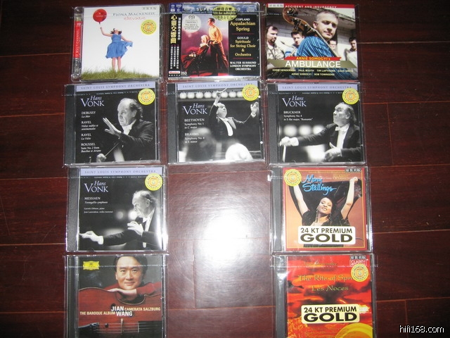 上周新拿到的几张唱片。其中四张是PENTATONE公司新出的HANS VONK的生前最后几次指挥圣路易斯交响乐队的现场录音,是对荷兰指挥家HANS VONK的致敬和纪念。也是PENTATONE公司用DSD录音出的为数不多的几张普通CD之一(据我所知除此四张外,好象只有一张班德拉斯解说的PETER AND THE WOLF是普通CD),2008年好象还要继续出四张。现在的四张的录音时间分别为PTC5186318为1999年和2000年;PTC5186319为2000年和2001年;PTC5186320为1999年;PTC5186321为2001年。2001年HANS VONK被诊断患了ALS(渐冻人),2004年于荷兰阿姆斯特丹过世。VANGUARD CLASSICS公司出的的SACD从编号VSD500到VSD512大都已经拿到了。