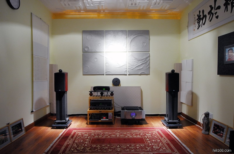 回無聲仿有聲的话,字画其实更多的是在装点房间,对于声音的的调校作用甚微。但是我认为房间6个面的第一反射点是处理的重点,至于怎样处理要根据自己的情况而定,不能一贯处之。我认为小房间其实是比大房间更难于处理的,尤其是低频,驻波很容易产生,我这次处理完后墙房间里也产生了“以前没有发现的驻波”,通过研究后发现是后墙第一反射点造成的,所以又布置成如图所示的样子。至于地毯的铺设,我认为在我这里仍旧是在对高频段的影响大一些,而且没有发现吸收过度的现象,不过就我的经验而言,两侧墙第一反射点的处理会对高频空气感、活生感影响大一些。