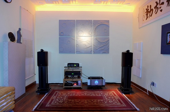 回無聲仿有聲的话,字画其实更多的是在装点房间,对于声音的的调校作用甚微。但是我认为房间6个面的第一反射点是处理的重点,至于怎样处理要根据自己的情况而定,不能一贯处之。我认为小房间其实是比大房间更难于处理的,尤其是低频,驻波很容易产生,我这次处理完后墙房间里也产生了“以前没有发现的驻波”,通过研究后发现是后墙第一反射点造成的,所以又布置成如图所示的样子。至于地毯的铺设,我认为在我这里仍旧是在对高频段的影响大一些,而且没有发现吸收过度的现象,不过就我的经验而言,两侧墙第一反射点的处理会对高频空气感、活生感影响大一些。