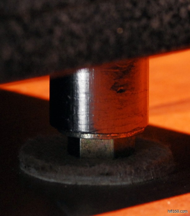 要特别交待一下的就是石板下支着的脚钉。这脚钉的组成材料是:石墨、金属、橡胶和空气。怎么还有空气呢?——因为空气会震动同时也可以阻绝震动。成品可利用石墨材料的寻找颇为费力,我也是在走遍大街小巷后才找到如图的构件。石墨的力学强度很差,是经不起重压的,因此要给它补强加筋,我选择了螺栓。在螺栓和石墨桶之间我还放置了橡胶组件用于连接与缓冲。至于效果如何我还是那句话——仁者见仁智者见智。我周围不少朋友听后都感觉对高频的改变很大,而且有不少人陆续用上了这些“憨厚不可爱”的小家伙!