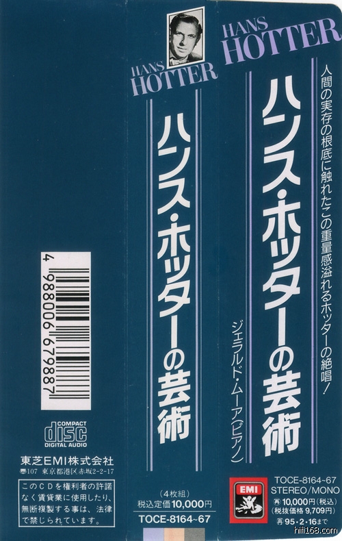 老东芝这套The Art of Hans Hotter虽然说只有4CD,不过采用翻页式的盒子设计,颜色也很好,厚厚的盒子拿在手里沉甸甸的,整套显得优雅、贵重,当然价格也不是开玩笑