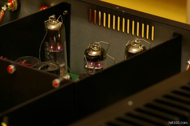 发烧级电子管 6922 担任,并由 6N6 低内阻管组成线性极佳的 SRPP 电路驱动晶体管电流放大器;由于电压放大器完全由电子管担任, 晶体管只是将电子管输出的小电流变为大电流输出, 所以其后级音色与电子管功放音色极为接近, 得到完美的音色表现。