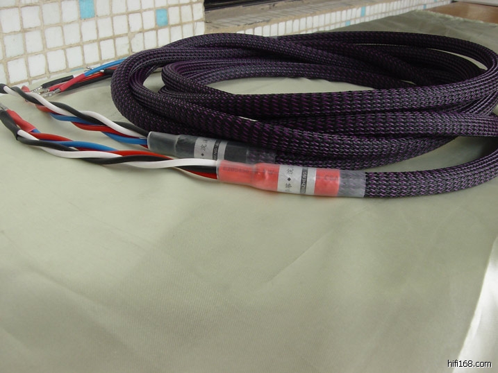 首先是做了一副喇叭线,加了避震网,头端两两绞合,尾端兵分两路。不用接插件,让声音直捣黄龙府,减少接驳失真。呵呵,外形不错吧!