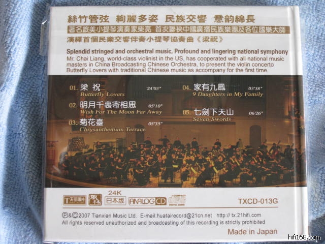 《梁祝》,是中国音乐史上的传奇!!大家应该没有意见吧?听音乐听了这么之年了,我还没有一张《梁祝》,近期听说中国自己的乐团自己的小提琴手出了一张,就买来试试,哈,还是24K金碟呢!!我刚听这张碟子的时候,觉得真的很不错,但在这里我不推荐各位大侠去买。我觉得这张碟在高潮段的时候有点凌乱(不知道是我的音响有问题还是录音的问题),还有一点,一定与器材没关的,就是柴亮在有些位里,会拉走音,有时还会随随便便就拉过去,没有肯定的演绎。不过总的来说,还是一张难得的《梁祝》!!各位有兴趣可以试 试,以上纯属个人意见,不代表坛子立场!