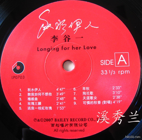 现在这张《秋水伊人》LP黑胶的曲目是根据两张专辑选出来的。与LP黑胶同期发行XRCD版本,两种软件载体,目前市面上只见有LP黑胶,没见XRCD。比1996年出品的《秋水伊人》CD唱片多了《送我一枝玫瑰花》、《天涯歌女》、《花儿为什么这样红》、《我愿是只小燕》等歌,显然,这些歌在《花儿为什么这样红》专辑;却少了《卖布谣》、《风雨催眠曲》等歌,那是没收录进来。