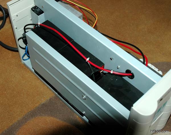 现在说回方波UPS 不能用在音源(开关电源的可以用)上,只好继续折腾准正弦波的,但正弦波逆变时逆变管的功耗变大,必须用散热器+ 风扇(不过后来搞清楚那是满负荷的设计)。曾经试过串三端稳压把风扇电压降到一半,结果我这个木耳朵都能听到风扇噪音,大虾们更不能接受!郁闷啊,真是创新不易哦!不过后来发现散热器其实并没有什么温度,干脆索性把风扇插头拔了,工作上好!不过机壳和逆变变压器之间还有一点共振噪音,发烧追求的就是安静,岂容半点噪声!说时快,那时慢!通过孜孜不断的探索,最后终于有了以下简单的改装三步骤: