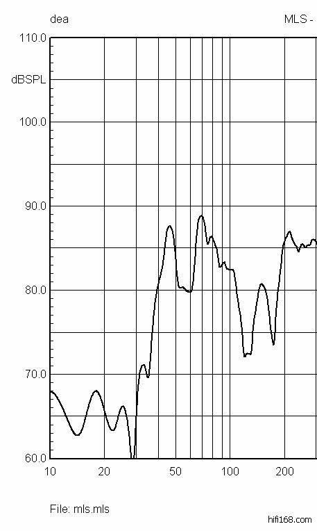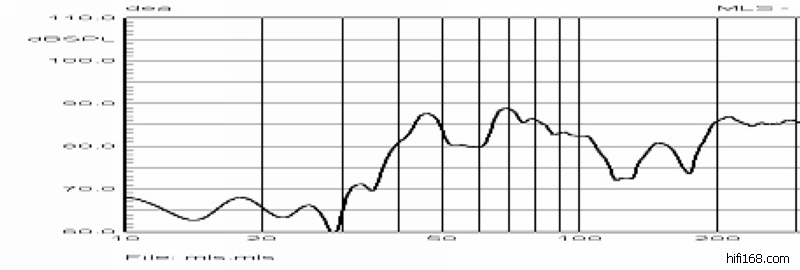 这是一个典型的“界面反射干扰”实际测量曲线,中低频单元中心距离侧面墙0.71m,箱子前面附近还有小柜子等反射物体,其形成的“谷”居然比标称灵敏度86dB低了十多个dB(分贝),如果不是界面反射干扰的原因,任何一个箱子请你做出这样的曲线,恐怕给再多钱也是做不出来的。