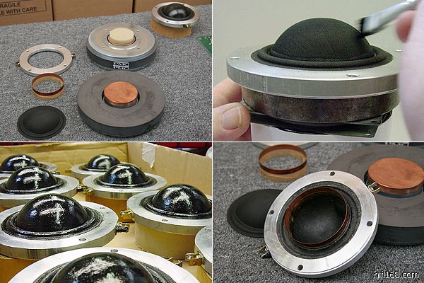 从单体、分音器、音箱等各部组件看过,最后就是把各部分组装起来的工作。组装的部门看起来并不复杂,其实都是手工,依照顺序把各部组件组合起来。奥妙在哪里?音箱内部阻尼物的黏贴!和吸音棉一样,都是经过反复聆听试验,决定阻尼物的使用量。