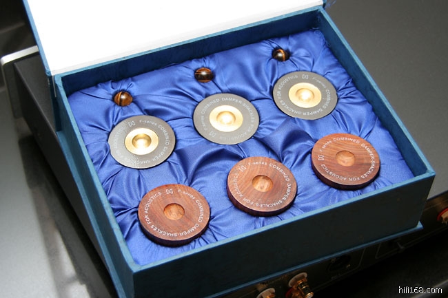这套钉有两大类,放在cd机、扬声器等等会动的器材上的,是配黑玛瑙;放在不会有震动的前级、后级、解码器上的,是配黄虎眼水晶,每套售价900多元。