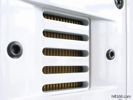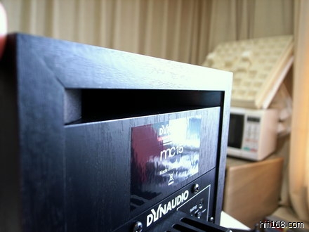 Dynaudio在MC15首度采用了长条状低音反射孔,开口两侧还有圆弧导流设计。为何采用这种作法,我的推测是MC15前后面板能用的地方都被占满啦,根本找不到地方开圆孔,所以只好利用背板上缘做一个长条状的开口。