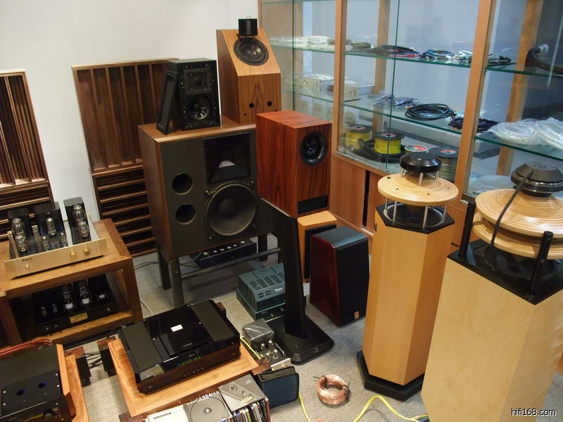 店中使用的前级和唱放都是MENN的产品,唱盘是先锋的皮带盘加德国的Souther直线臂加高度风1K多的MC唱头,这么便宜的唱头出来这么有质素的效果实在让我大感意外。仔细研究下发现这个先锋的唱盘的木质底座和那几个铝合金高脚原来专门定做的,最特别的是安放唱盘的几个轻质水泥砖块,据说是MENN在附近工地上拿一包香烟从民工的手里换回来的,现在那些民工碰到MENN都会问他:“还要不要砖头啊?”