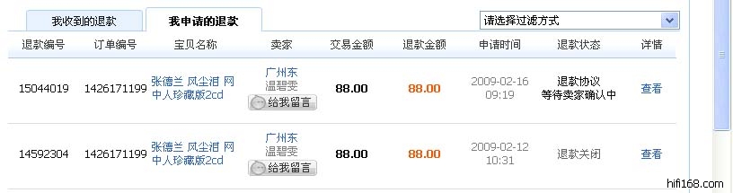 这不是欺骗是什么?几天后2月12号我看还没有发出,打他电话确认没有货后,我要求退款,结果卖家态度非常恶劣,不退,挂断电话。 我马上申请了退款(12号),从另一个卖家(金钻淘碟)买了张曲目大概相同的,但是我支付宝钱不够了。要求