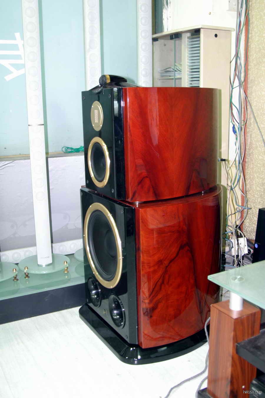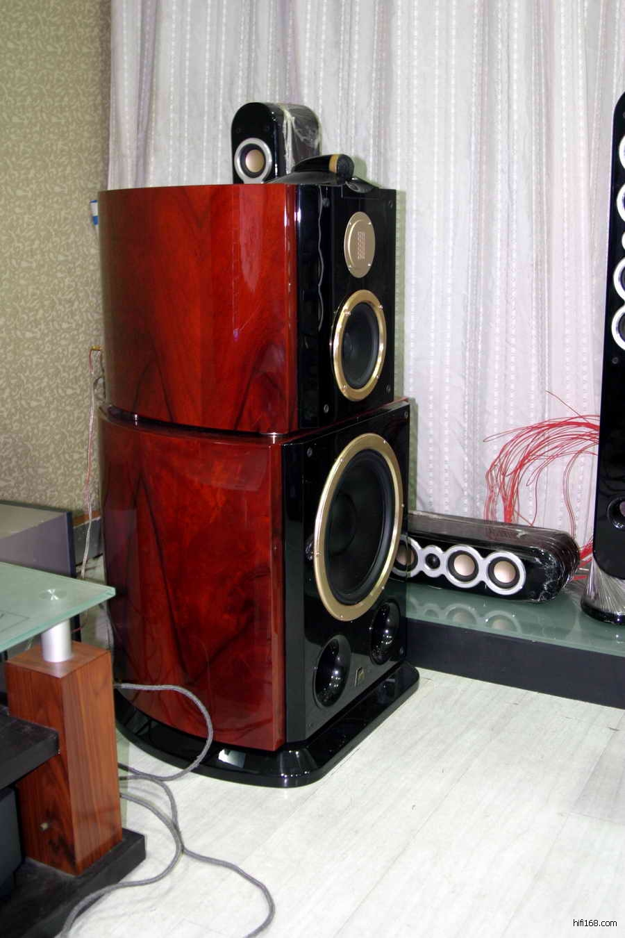 真正的大系统 人耳可闻声音的频率为 20Hz 至 20kHz ,要完美地重放出这个频率范围的信号,不是那么容易的。由于电影伴音中包括许多大分贝的声响信号,如地震、爆炸、洪水等超低频的信息,所以低频准确再现就成为一个很重要的要求。为能表现好低频, HiVi F5HT 的主扬声器,采用了 380mm ( 15 英寸)口径的低音扬声器,它可以轻易地重放 30Hz 以下的超低频,这是小口径喇叭单元,我个人是第一次见到。用这么大口径的喇叭单元制作出来的扬声器,当然就是一个巨无霸了。主扬声器为分体式设计,由底板、超低音箱、中高音箱三部分组成,箱体间有尖钉作“连接”,避免相互间的影响。环绕声、中置扬声器也是为大系统设计,体型也比较大。作为一个影院系统来看,彼此很般配、协调。
