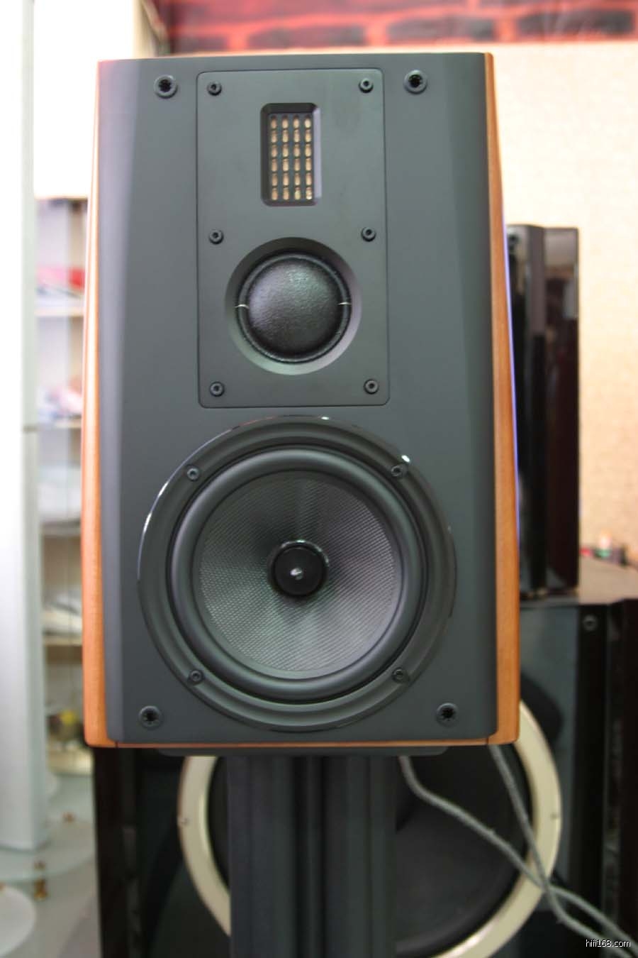 喇叭单元 这套影院扬声器的喇叭单元很有特点,不但采用了一些新型单元,而且把专业喇叭单元与民用单元“混”用。主扬声器、中置扬声器、环绕扬声器一律采用相同的高音及中低音喇叭单元。 主扬声器的超低音单元是由专业用的喇叭单元改良而来,可以轻松地重放 30Hz 以下的超低频信号,低频表现一级棒。 中音单元,实际上应称为中低音单元更恰当,这款口径为 160mm ( 6.5 英寸 )的喇叭单元频带很宽,超过一般的中音单元。而且频率响应特性平滑,担当电影中人声对白重放,有非常好的表现。 高音单元采用了惠威著名的 Diva 系列扬声器上用的 28mm 大功率球顶高音,声音通透、润泽是其特点。 在家庭影院扬声器系统使用超高音单元,对惠威来说已经不是第一遭,在这套 F5HT 影院扬声器系统中使用了一只最新的 RT1. 3 的等磁场带式超高音,这款新单元的振动发声的面积较惠威深受好评的等磁带式超高音 R1 增大了一倍,而且超高频表现依然快速无比、清晰透明。