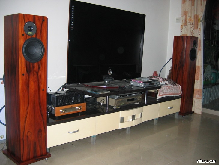 今天将我以前的惠普小旋风PM60MK2和斯巴克265A送给了一位老同学。家里有位置放威马的10周年落地箱了。下午4点多匆匆赶到联盟提货。CD和扩音机因暂时还没位置放,暂未提。回家在老婆、女儿的配合下安装好。哇连座和钉脚超过1米啦。木纹非常漂亮,虽然相体的深度比原来的箱要浅,但还是有点高贵的气质。接上斯巴克的MT35(EL34)胆机,马兰士63MK2CD,出来的声音比旧箱的音色更“纯”,高音没有“飙”,很耐听,有些贵气了。于是唱片一张一张地轮流上:茶花女变奏曲,胡利奥,伦敦提琴曲精选,安德列波切尼的“爱慕”,许乐的“钢琴随想曲”,雨林A2HD“女声篇”,青燕子演唱组“5周年特辑”……美妙的音乐不停地流出,听到不愿熄机。听青燕子5周年特辑的“茉莉花”,“心恋”三个少女:陈洁丽、马小倩、许岚岚的三重唱层次清晰,和谐统一,还有恰到好处的配乐,简直听出耳油,舒服极了。在此再次感谢威马,欧阳。昨日听欧阳谈及调音工作是一份很枯燥的任务,很累很辛苦。现在听到其调出来的声音,显然成绩是可喜可贺。过两天再去提CD,扩音机,看来每天都要抽时间听音乐了。