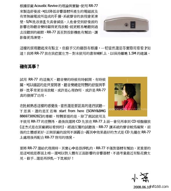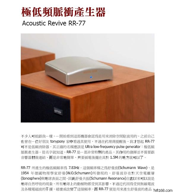 负离子产生器?AcousticRevive这家公司还真是特别,虽然说是生产音响产品,但产品的观点“很”不一样,还记得刚介绍过的Acoustic ReviveRR-77吗,他是用来产生固定极低频(7.83Hz)的器材,这种又称之为舒曼波(SchumannWave)的频率不仅对声音有所改善,更重要的是对人体也有正面的影响,在将RR-77还给代理商后,总是觉得少了些什么,因此虽然手头已经很紧了,最后还是按耐不住订购了一台给自己用。