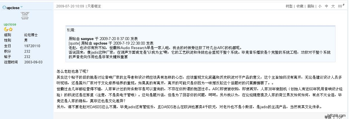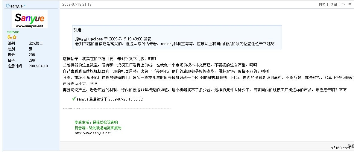 赵兄,你提到了面具的问题,我不太苟同。我2003年开始在hifi168注册,也浏览,也发表自己的观点,或喜欢或不喜欢,我有我的注册ID,大家用自己的ID发言这是网络规范,难道你规定所有说三越不好的ID都要实名认证吗?