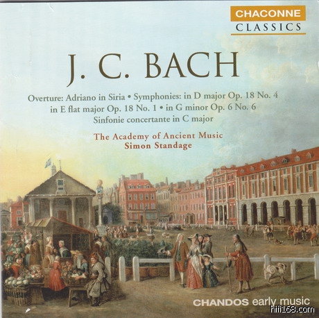 我昨天仔细听了J.C.BACH的曲子,就是下面这张,感觉这位巴赫最小的儿子真是十分了得,身手绝对不凡——莫扎特当时只佩服两个人,一个是海顿,再一个就是这小巴赫。小巴赫只活了47岁,最后20年是在英国度过的。他的序曲和交响曲曾经是英国音乐会上常演不衰的曲目,直到海顿的伦敦交响曲在英国取得成功。这张碟中的第三个曲目交响协奏曲中的四样乐器是长笛、双簧管、小提琴和大提琴,与莫扎特为长笛、双簧管、圆号和低音管所作的交响协奏曲有异曲同工之妙,不知他们是谁受的谁的启发?那手法和意境真如出一辙(8月5日亚洲爱乐演的莫扎特就是这曲子,所以还记忆犹新),其交响曲中的气像万千之势已不输同时代的任何人。