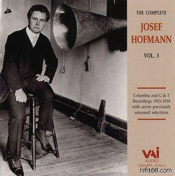 为了尽可能彻底地认识一个钢琴家,我们至少应该分析他/她的全部录音,这一点在霍夫曼这就特别适用,下面细细道来。他在1903到1923年间只录下了数量稀少的商业录音,这些你可以在VAI公司的“The Complete Josef Hofmann”的第3、4辑中找到(一共3张CD),飞利浦的“20世纪伟大钢琴钢琴家”系列只从中选择了一些曲子。但是还是有些遗憾,不仅仅是因为这些声学录音的拙劣的音质,更重要的是它们展现出的远非这位伟大的钢琴家艺术的全貌。不过我们仍然能从这些演绎中听到让人汗毛直竖的钢琴技术(就我个人的观点,霍夫曼有着比我已经提到和即将提到的钢琴家们更出色的技术)。从音乐性上讲,很多时候弹奏地像机器人——节奏单调、死板,缺乏个性化的格调和激情。请听听他的肖邦即兴幻想曲(Fantasie-impromptu)的中间乐段,用了无生趣来形容一点也不为过。当然也有一些例外,比如他用优雅而漂亮的细微变化来处理陶西格改编的斯卡拉蒂《牧歌及随想曲》(Scarlatti-Tausig:Pastorale And Capriccio,我觉得霍夫曼可能曾是一位出色的斯卡拉蒂演奏家,但是可惜的是这是他唯一一首斯卡拉蒂录音)。还有他在演奏门德尔松“回旋随想曲”(Rondo Capriccioso, Op.14)时闪现出的深深的激情,每当听到这些“亮点”都能让人切身体会到血压和心跳随着乐曲而起的变化。