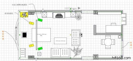 2、现因上投影,打算将音箱摆短边。调整到浩歌527摆法(绿色位置)得到基本平衡的声音。但低频仍显浑浊。高频比较硬。