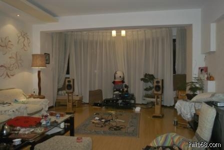 3、音箱后墙是阳台封闭出来的,因此背墙是4.8*2.8m之曲面玻璃。反射太厉害,低频也不好。使用厚窗帘能解决一些问题,但低频还是不好搞。