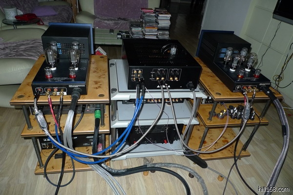这样原来的HERRON和MARK23.5的胆石搭配听了一段时间。23。5有着不错的驱动力和精细的细节刻画能力,只是相对清淡理智的风格和我所追求的声音有着较大的差距,因为我的心里还是念念不忘300B的美声。经过一番考察和比较,最后从临近城市的老烧手中接了对成色和状态良好的300B推挽双单后级-CANARY金丝雀CA303SE。金丝雀这个美国品牌比较低调,303SE是他家的老旗舰,设计的许多方面,特别电源和输出牛的绕制借鉴了西电名器WE86A,定价比较克制,以价论声,有着很高的性价比。输入放大级每边采用一对6SN7,一对5AR4推动一对300B做推挽工作,提供24瓦的纯甲输出功率。上家非常大度,除了全套跟机管,还以比较廉宜的价格将自用的古董管一起出给了我,其中包括两对RCA5692,两对大盾CV378(GZ37整流管)以及两对07版的复刻西电300B。