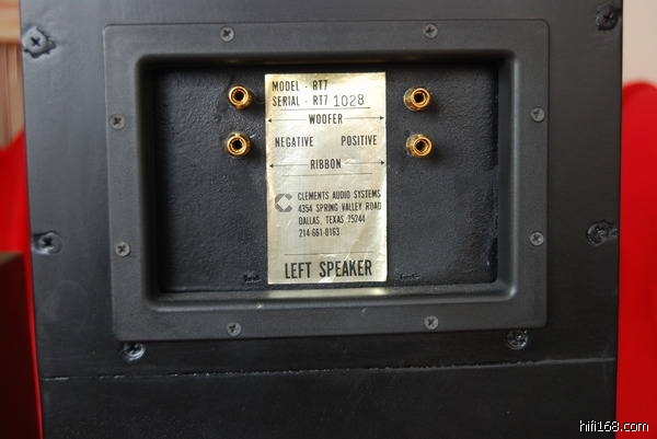 美国CLEMENTS克莱门斯REFERENCE RT-7旗舰,顶级7寸+4寸长Kapton Ribbon平面高音及超高音,可至150KHZ,8寸Kapton 低音,悬边由英国订制,是世界上最薄的悬边之一,配合Compression Line反射迷宫箱体,低频可下潜26HZ。分频点1575Hz,Wonder-Cap与Solen电容,以及陶瓷电阻分音器。喇叭高146CM,宽27CM,深50CM,重量为50kg。效率88dB,阻抗6.5奥姆。喇叭端子是Tiffany制品,可作Bi-Wiring用,它还有三段每段2.5dB的高频增益设置调节,可以对不同的环境做高频的补赏。 高频有屏风喇叭的清晰与宽松自然,贵在与中低频的衔接良好,结构类似马田芦根的思路,声音颇有MBL的味道。