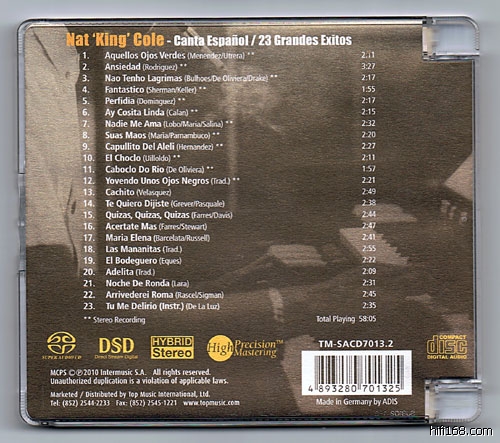 最近天乐唱片公司用最新的顶级SADiE DSD Series 5 数位混音工作站将Nat King Cole的西班牙歌曲做后期母带处理,用SACD格式出版了这款唱片,唱片里面精选了探戈、喳喳等等舞曲旋律节奏的西班牙语歌曲。