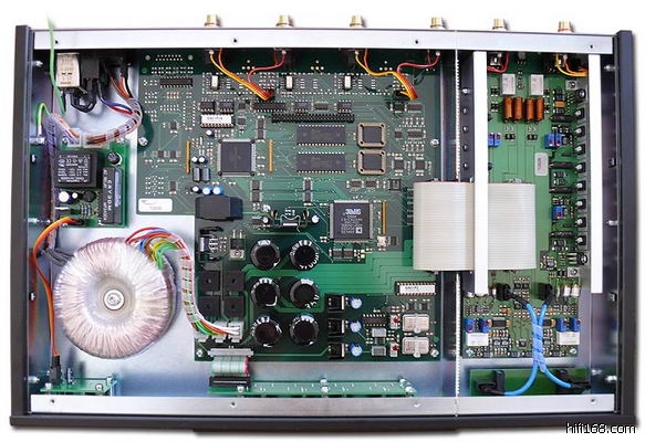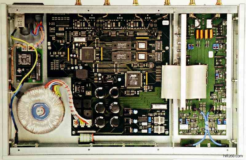一代的Medea是支持双路AES接收192信号,单路只支持到96K,我拆开看过接收IC是两片CS8413。借刘汉盛的图片可以看看一代,接收晶片在中间的排线上面,注意看两个双排贴片SSOP封装的元件就是。