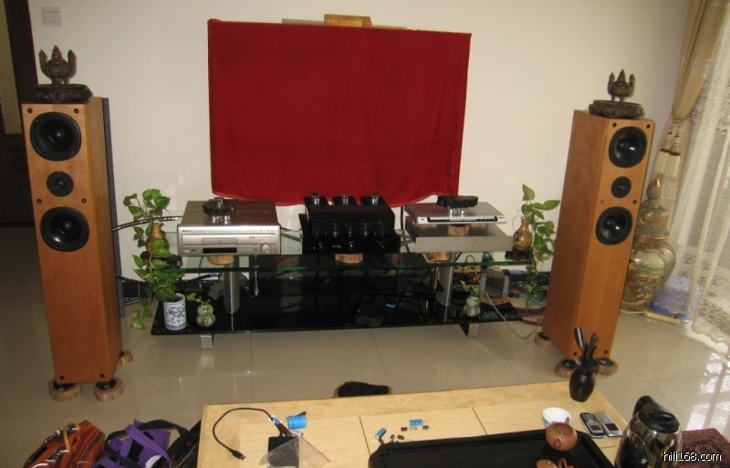 杨先生原来是我(前仙乐厂)的长期拥趸,他现用的器材,除一部国产Melody H2A胆合并机(万余元的入门产品)之外,所有线材和音箱,都是10多年前仙乐厂出产的拳头产品,包括MagicLink油浸信号线、Damp沙电源线和音箱线等等、音箱是1994年在北京音乐台力压体积大数倍、价值20万的进口箱,又在广州获金奖的仙乐S2。为验证改机换线的威力,杨先生还请来3位烧友做一起鉴证。