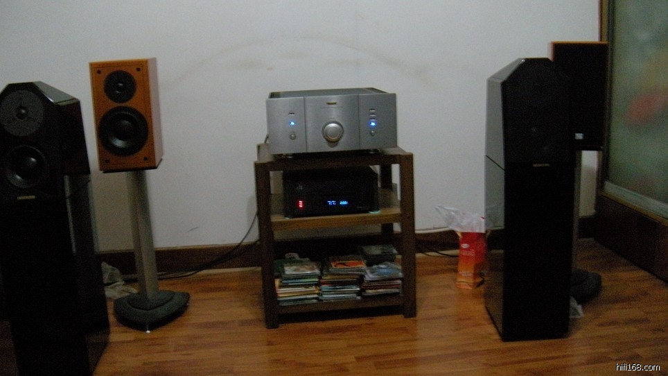 这次到曾兄家里意外的见到了传说中的单拿高音皇 确实是名不虚传 非常的亮丽 但是又不刺耳 和BW的话筒高音有的一比 曾兄的系统开始听的还是可以的 因为A600的前级太垃圾 所以他是用怀念6直接接后级的 当场我们还对比了接A600的前级 一听之下 差别太明显了 我也没有想到A600的前级这么垃圾 比用CD机直接通后级差了很多 就像蒙了一层厚厚的灰 根本就 没有办法听 接着就是听那对高音皇了 二手花了17K 具体什么品牌我不认识 相信很多烧友都认识 这个比小丫2.1强多了 其实这个也是书架 他下面的那一截纯粹是做脚架用的 开始听小丫的2.1也还感觉可以 一听这个就发现他差的太远了 那个2.1曾兄还花了1600换了两个9700的高音的 但是和这个比起来 差的太远 当然价格也差的太远 由于梦相已经中了黑胶的毒 只想着去林兄家里听黑胶 所以这里也是匆匆走过场 马上就奔向林兄家里去**了