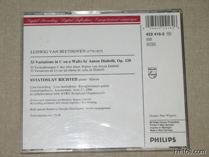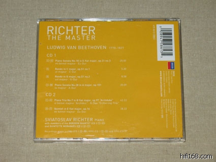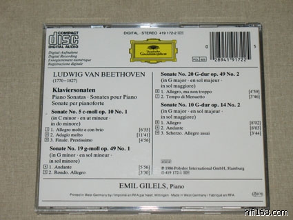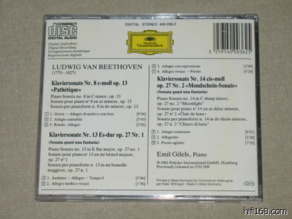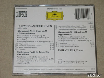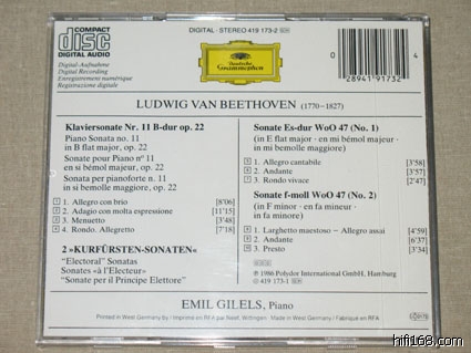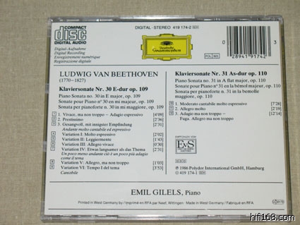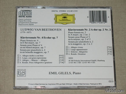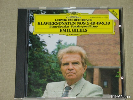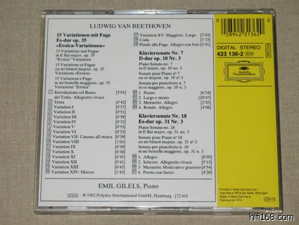 第一次听贝多芬往往会觉得吉列尔斯的最过瘾,因为这套CD是愉悦感官的一套录音。市面上比较常见的是9CD廉价版。录音是贝多芬钢琴奏鸣曲的准全集。除1,9,22,32四首未录外,其他的贝多芬钢琴奏鸣曲都录音了。包括32首奏鸣曲外的WoO 47两首,另外还有英雄变奏。该套录音尽显俄罗斯钢琴学院派的风范:    曲目如下:CD1:  Piano Sonata No.2 in A, Op.2 No.2  1    1. Allegro vivace [7:01]     2    2. Largo appassionato [7:32]     3    3. Scherzo (Allegretto) [3:28]    4    4. Rondo (Grazioso) [7:31]