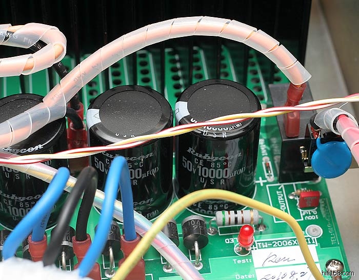 采用八只东芝2SC5200/2SA1943大功率管输出,另外功率管上面加了清逸伦自己开模具做的纯铜减震片,抑制功率管的谐振。