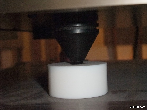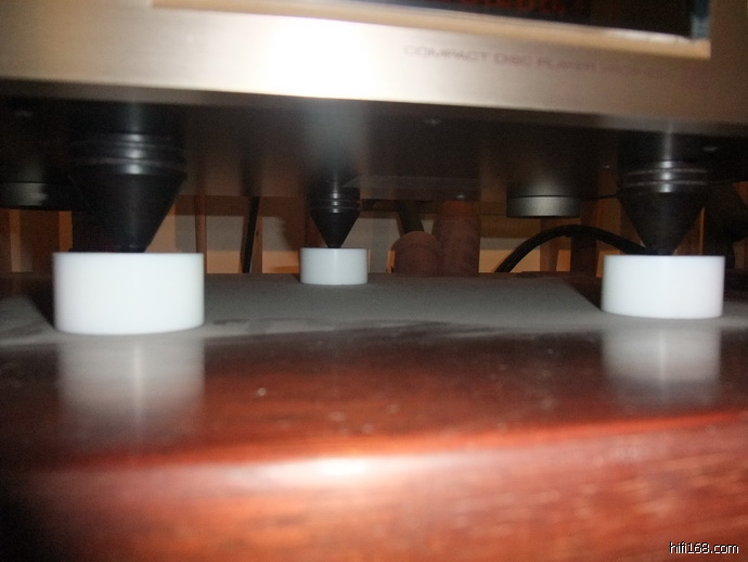 CD底下化震钉的位置是照加拿大发烧前辈“弹弓杨”的重心定位法进行定位的,声音效果非常好。补充说明一下,两层钉中上面的化震钉是黑檀水晶钉,下面的是一种很特别的塑胶材料。