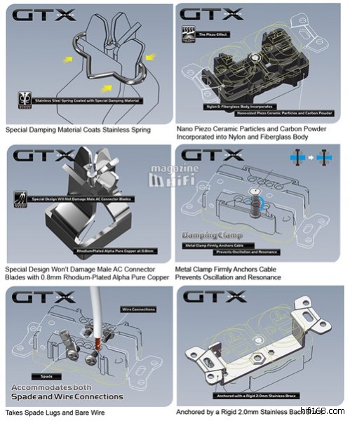 在材質使用上,GTX插座本體使用奈米陶瓷微粒、碳粉、尼龍和玻璃纖維組合而成的複合材料製成,內部採用Alpha pure copper紅銅導體,表面再經過24k鍍金或鍍銠處理,增加導電性與抗磨性,廠方特別強調,接合部件加上了特殊設計的導體彈簧系統(Conductor Spring System),而且還是無感磁不鏽鋼材質,拔插電源插頭時,不易刮傷金屬接觸部位。另外,廠商也表示,該產品所有金屬配件都經過Furutech自家的Alpha深層超低溫無磁性處理。