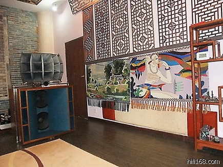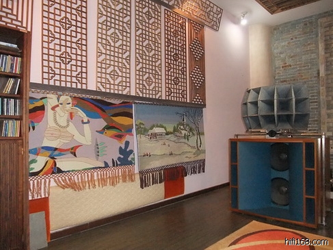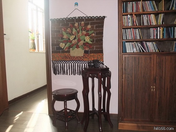 聆听室侧墙靠近皇帝位处用装饰架和书柜作扩散处理,声音效果很好。