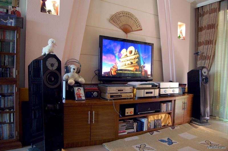 背景墙是实木板直接装墙上并贴上德国吸音布,自己上墙漆,立体像舞台部分是实木中间填充材料,外贴凹凸不平的德国墙纸,最得意的是电视柜制作,自己设计,买材料请木工制作,顶板是40MM以上的实木面板(两层20MM的硬木板粘合)再贴上胡桃木皮,左右两边有十五度左右的向内切,以改善声音传播方向,样式当时是以家庭影院为主,有橡胶避震脚,挺实用,虽然现在遍地能买到器材架,但现在我舍不得扔掉这个老古董,有原因是制作得太结实了,重量大概有近两百斤左右,自重加上避震橡胶垫,避震还是不错,左右抽屉装满CD和杂志。客厅是半吊顶,有直角的地方全部用石膏角边圆滑处理,右边是双层窗帘,一层半透的是常用的,厚实的那层平时都卷在一起挂在墙角吸收前右和后右边的低频谐振;沙发是真皮,后墙是国画,墙面没什么处理,听的时候在沙发肩上与国画之间放块发泡板......(国画有机玻璃镜面对音响不利,以后会自己画幅油画并在里面填上吸引材料,并在两边和天花板装上保丽龙扩散板)